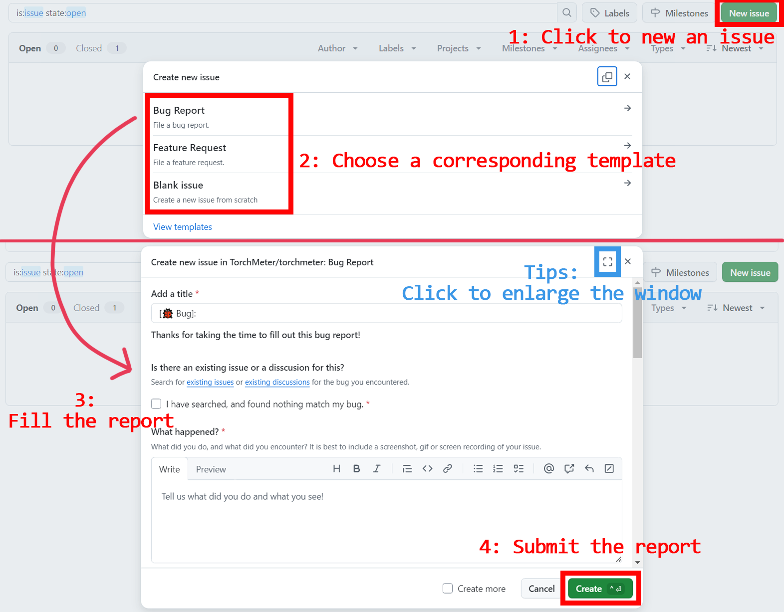 Issuestab and clickNew issue. - Select the template matching your scenario (bug report, feature request, etc.).